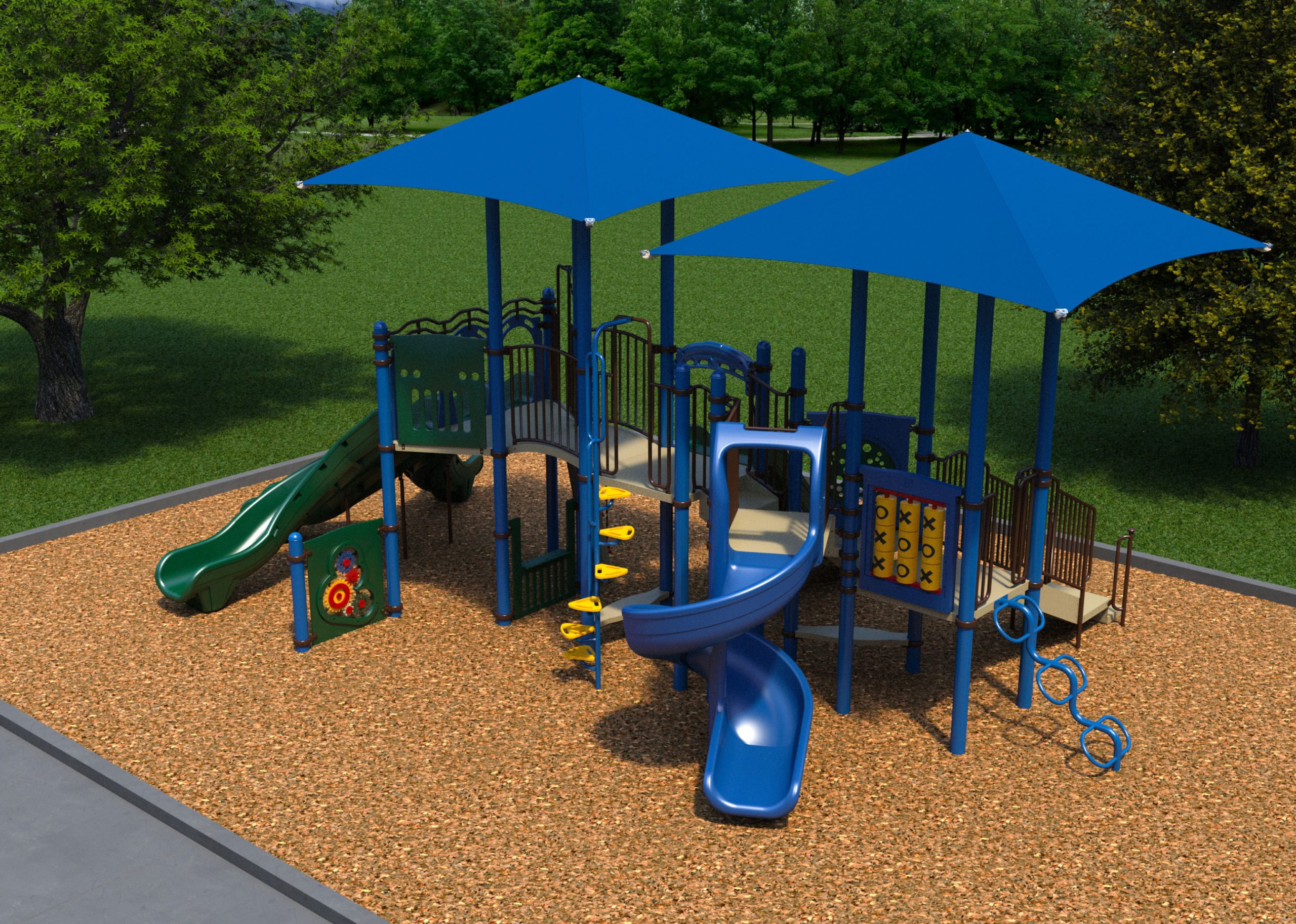In San Diego, where we have fairly warm climate year round, providing adequate shade for children is important. This design accomplishes this task by incorporating two twelve-foot shade canopies that cover a majority of the structure. Furthermore, some of the play components such as panels, can be found on the ground level where the structure itself offers yet another level of protection from the sun.