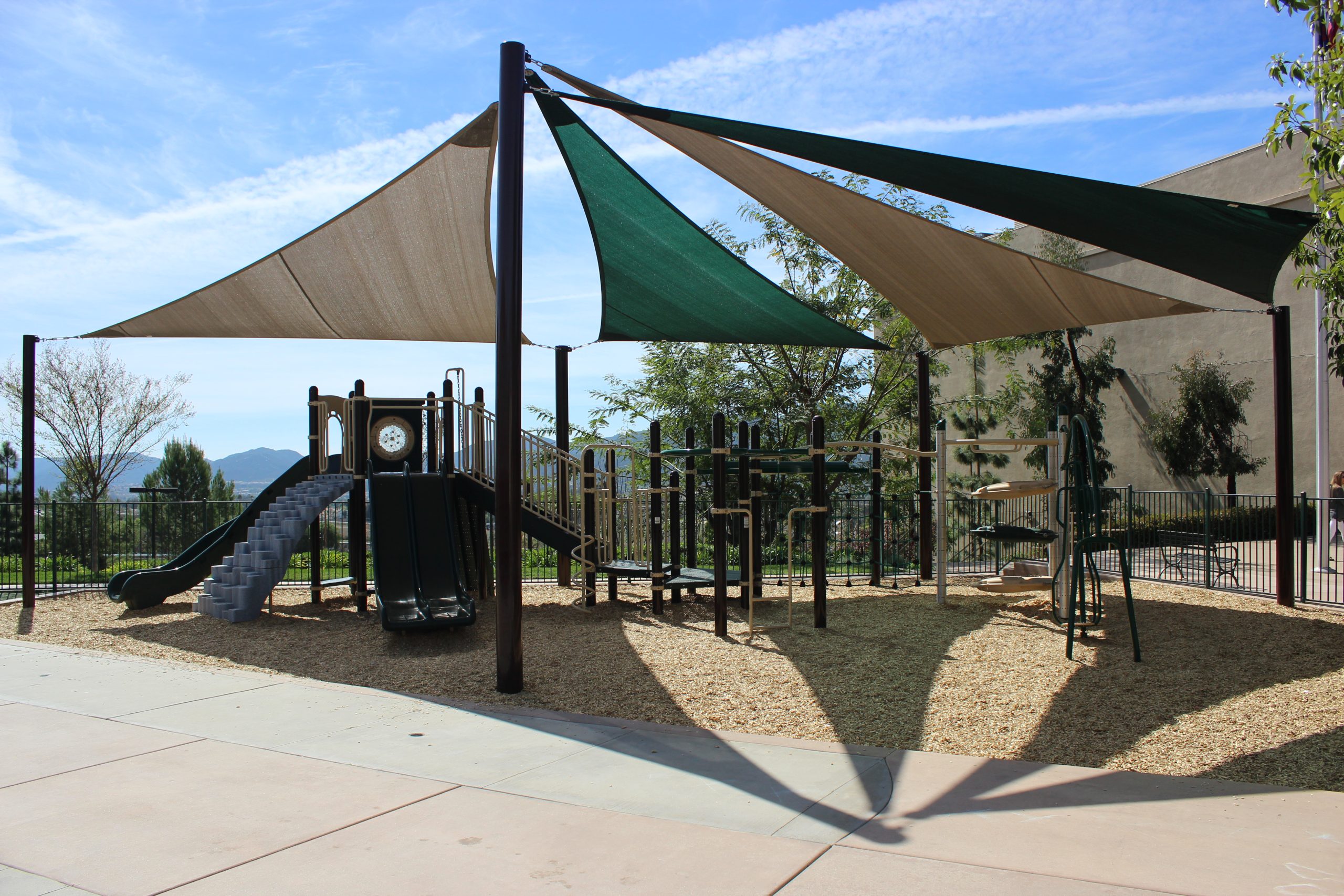 In addition to the design and installation of the play structure at Cornerstone Community Church, Pacific Play Systems also custom designed and installed a new multi-triangular shade sail structure. Providing shade over the entire play area, this attractive shade sail system will not only keep children cool during the hot summer months but also further complements the overall visual attractiveness of Cornerstone Community Church’s newly revamped playground area.