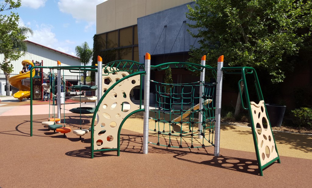 This latest Riverside church school playground project was custom designed by Pacific Play’s designers after carefully considering the school’s vision for the project. Since Harvest Christian’s existing play structure contained a more traditional design, the school decided that Playcraft’s distinctive Revolution line would offer an alternative and engaging addition to the school’s play environment. Playcraft’s Revolution line is well-known in the playground industry for its unique play opportunities, its emphasis on physically challenging play, and its sleek modern appearance. And Harvest Christian’s new playground is now certainly everything the Revolution line is recognized for, especially in terms of challenge. Although just medium-sized, the playground contains an absolute abundance of tough climbing components. And furthermore, many of these climbers are large components that allow several children to experience the event all at the same time. Some of these Revolution climbers include a Tri-Ring Hub, Cube Rope Net Hub, Arch Loop Traverse, Freeform Climber, Arched Lunar Climber, Slither Climber, and more! Additionally, the playground also features the popular Tri-Pad Jungle Traverse, a component consisting of multiple balancing pads to be traversed across one step at a time.