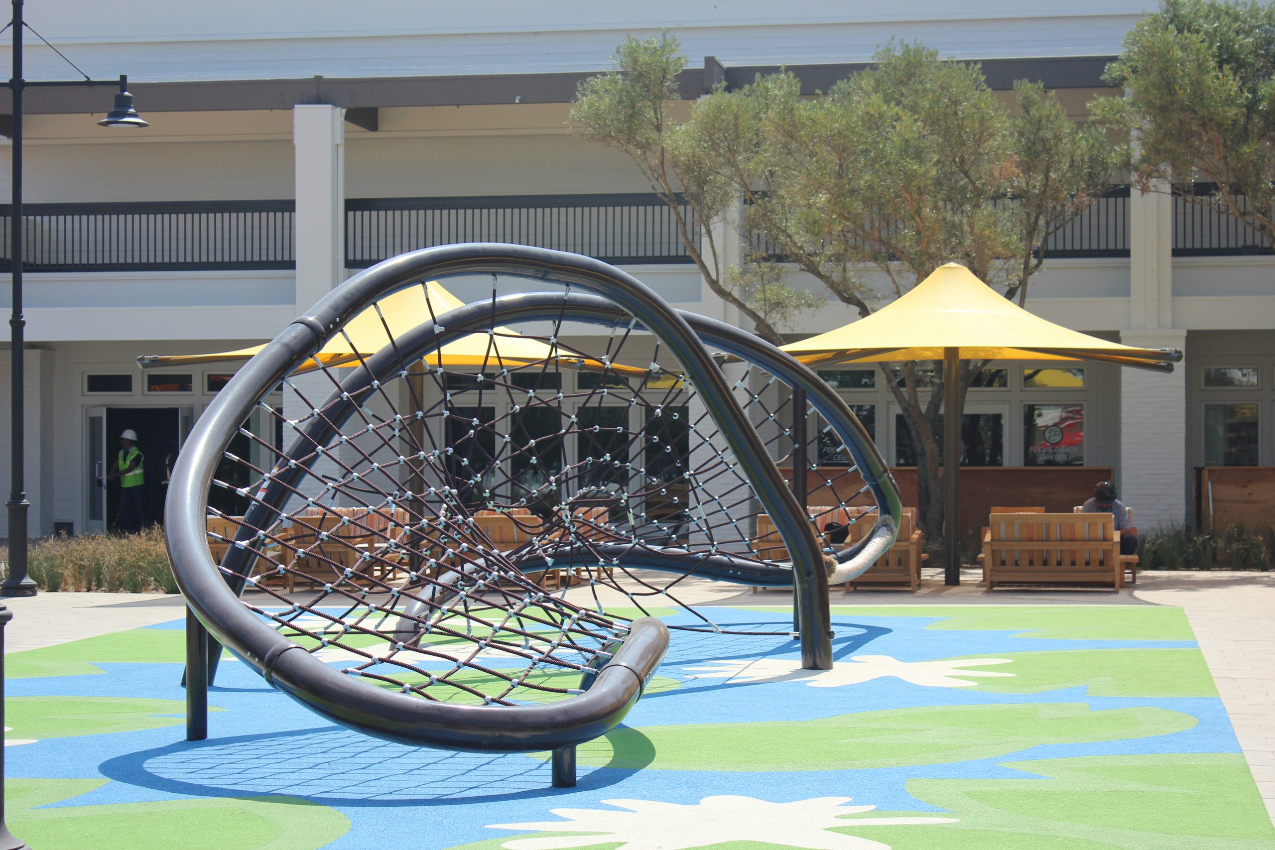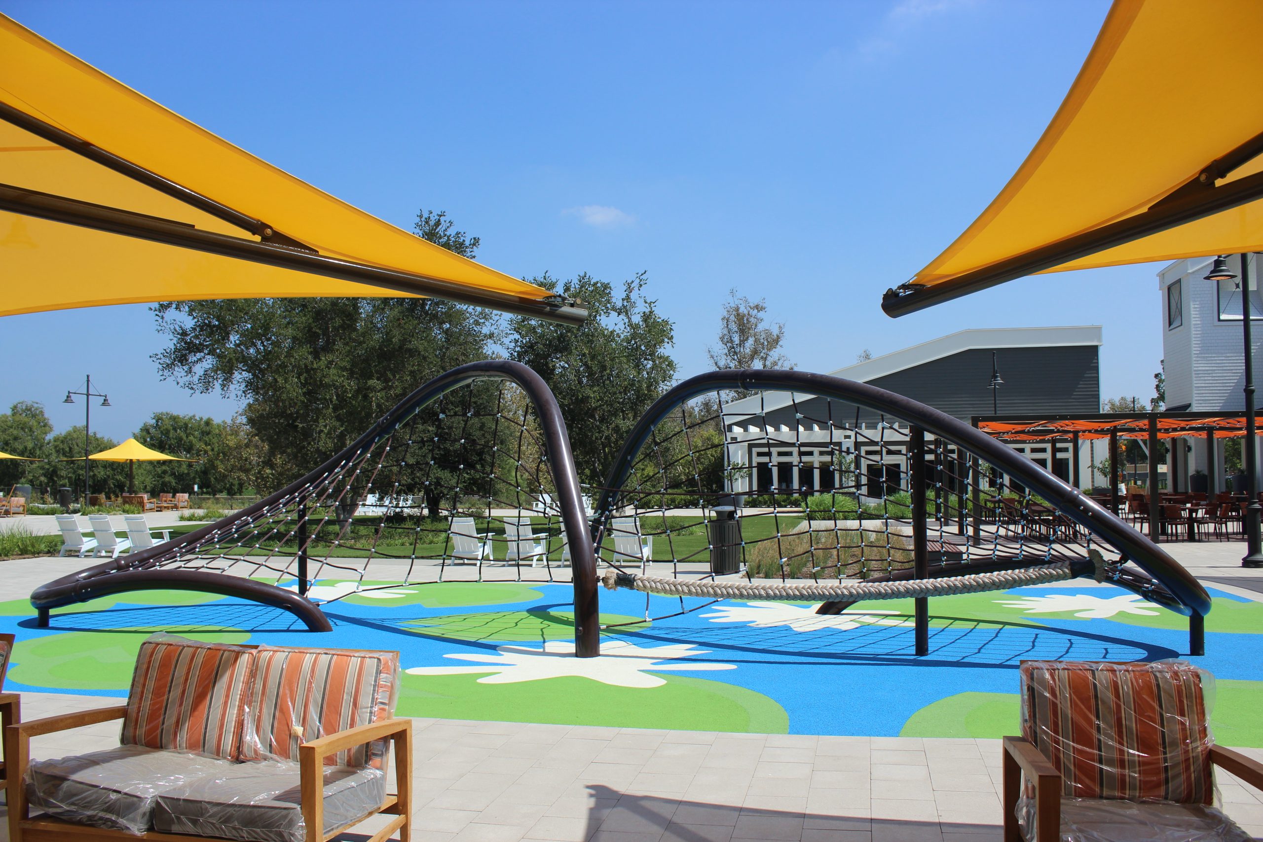 A new custom-designed Dynamo rope net playground called “Shoot the Curl” was recently installed by Pacific Play Systems at the Woodbridge Village Center in Irvine, California. Located in Orange County, the Woodbridge Village Center offers a mix of shopping, dining, and a place for community gathering. In 2016, The Irvine Company sought out a plan to revitalize the shopping center with a concept to include a new playground area for children ages 5-12. Pacific Play Systems, a leader in the design and installation of commercial playground equipment in southern California was thrilled to work with The Irvine Company. Knowing they wanted something exciting and different, Pacific Play’s designers teamed up with Dynamo Playgrounds to design a unique play area for the popular shopping center.