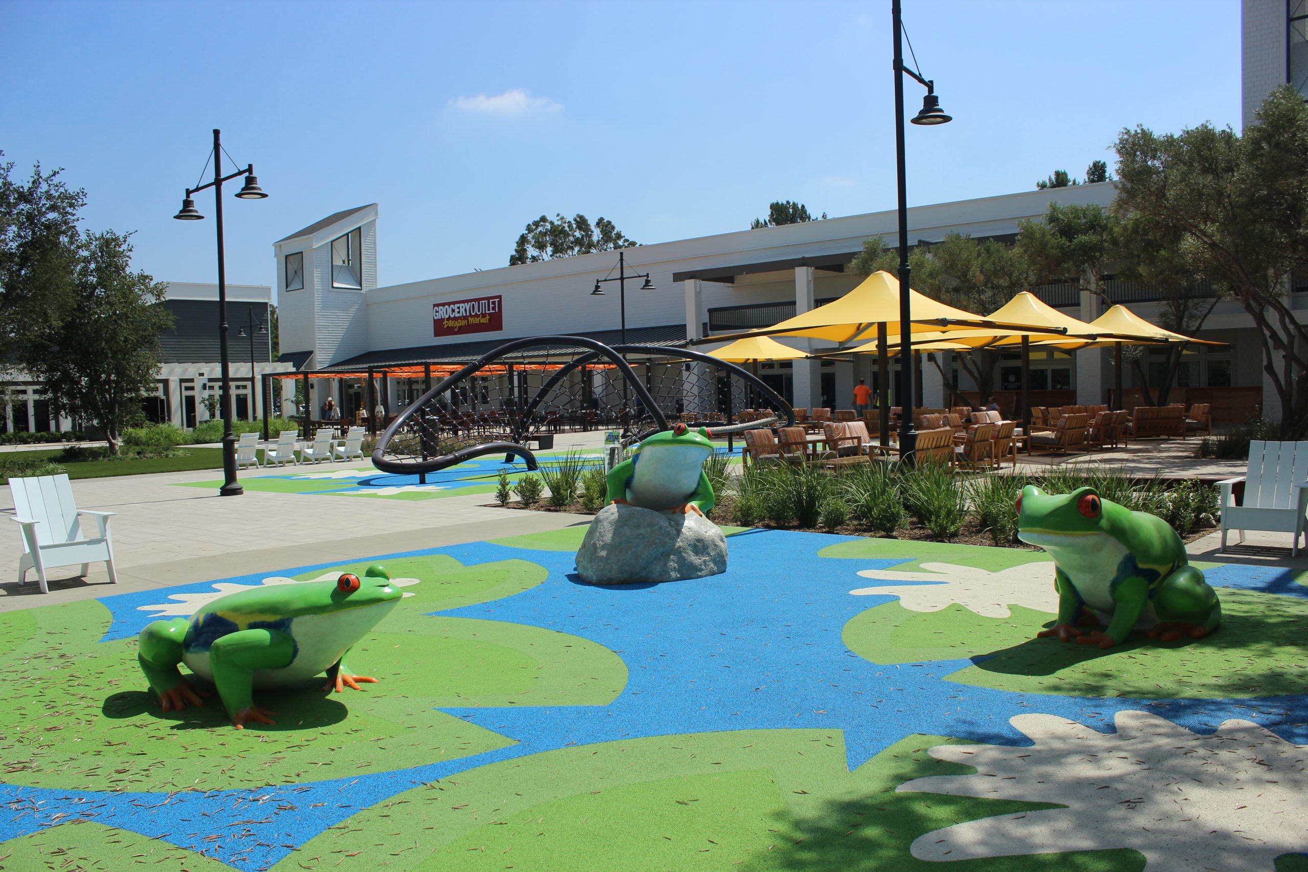 Additional aspects of the Woodbridge Village Center project included the installation of playground surfacing and, as we all know, surfacing plays a significant role in designing a playground. To give this play area a lively look, Pacific Play provided a green and blue colored lily pad design for its poured-in-place surfacing. This new project completed by Pacific Play at the Woodbridge Village Center has brought new spark to the shopping center and to the community of Irvine!